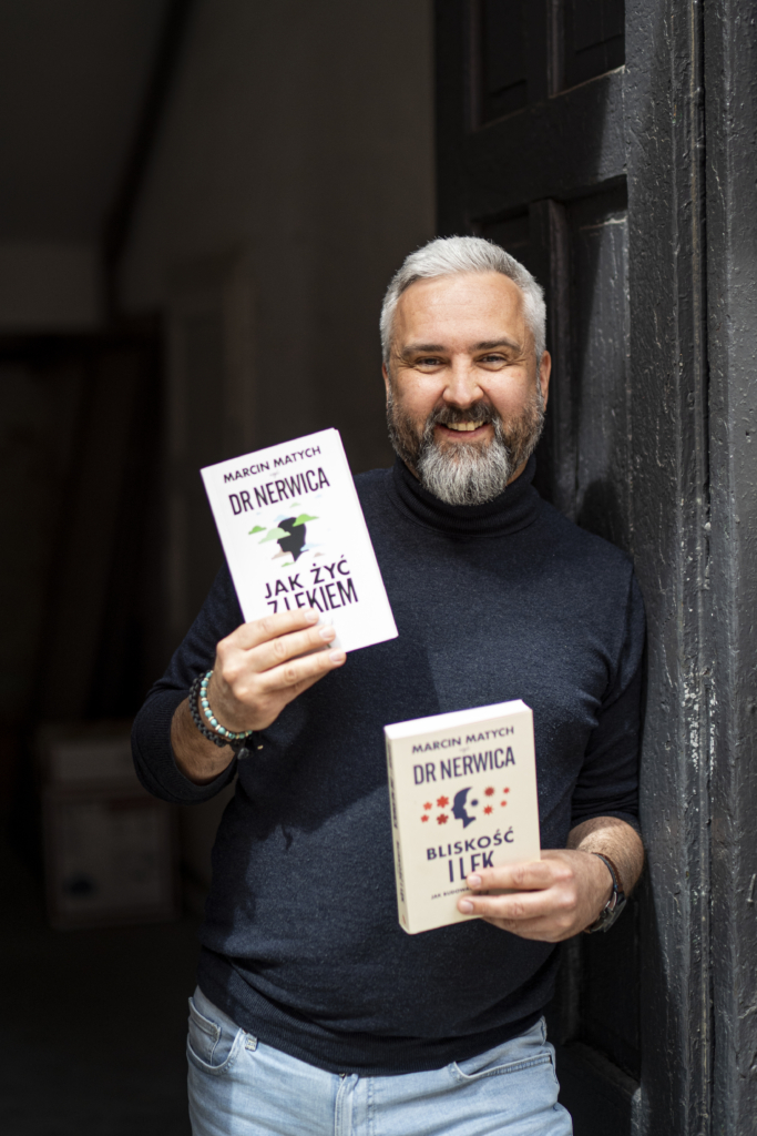 Marcin Matych Dr Nerwica – twórca metody terapii zaburzeń lękowych opisanej w poradnikach „Jak żyć z lękiem” oraz „Bliskość i lęk. Jak budować lepsze relacje”.