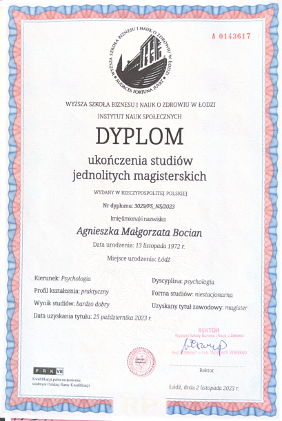 - Psychologia, studia magisterskie (Wyższa Szkoła Biznesu i Nauk o Zdrowiu w Łodzi)