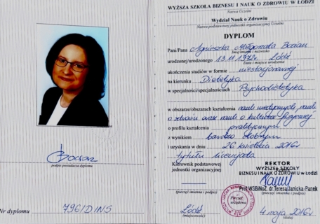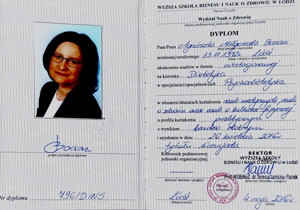 - Psychodietetyka, studia licencjackie (Wyższa Szkoła Biznesu i Nauk o Zdrowiu w Łodzi)