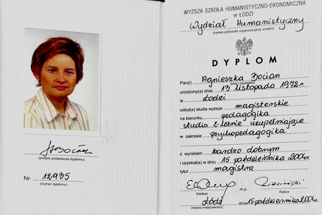 - Psychopedagogika, studia magisterskie (Wyższa Szkoła Humanistyczno- Ekonomiczna w Łodzi)